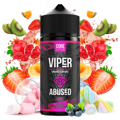 El aroma Abused de Viper Core Edition ofrece una fórmula perfeccionada para el deleite de los amantes de los frutales con un núcleo de fresa y melón, un estallido de granada, kiwi, frutas del bosque y malvavisco.