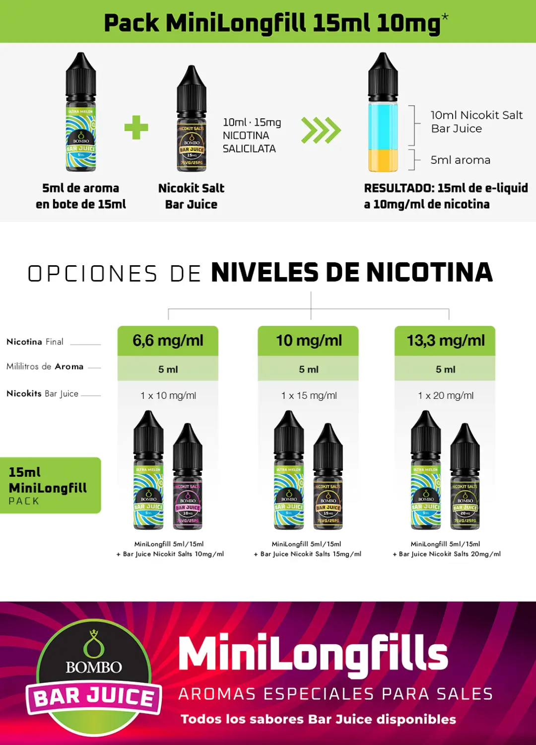 Los Aromas MiniLongfill permiten ajustar la concentración de Nic Salts según las preferencias de cada usuario, adaptándose a diferentes necesidades de consumo. Para mantener la fórmula original y el sabor auténtico de la gama Bar Juice Nic Salts, es imprescindible utilizar el Nicokit Bar Juice de Nicotina Salicilata.